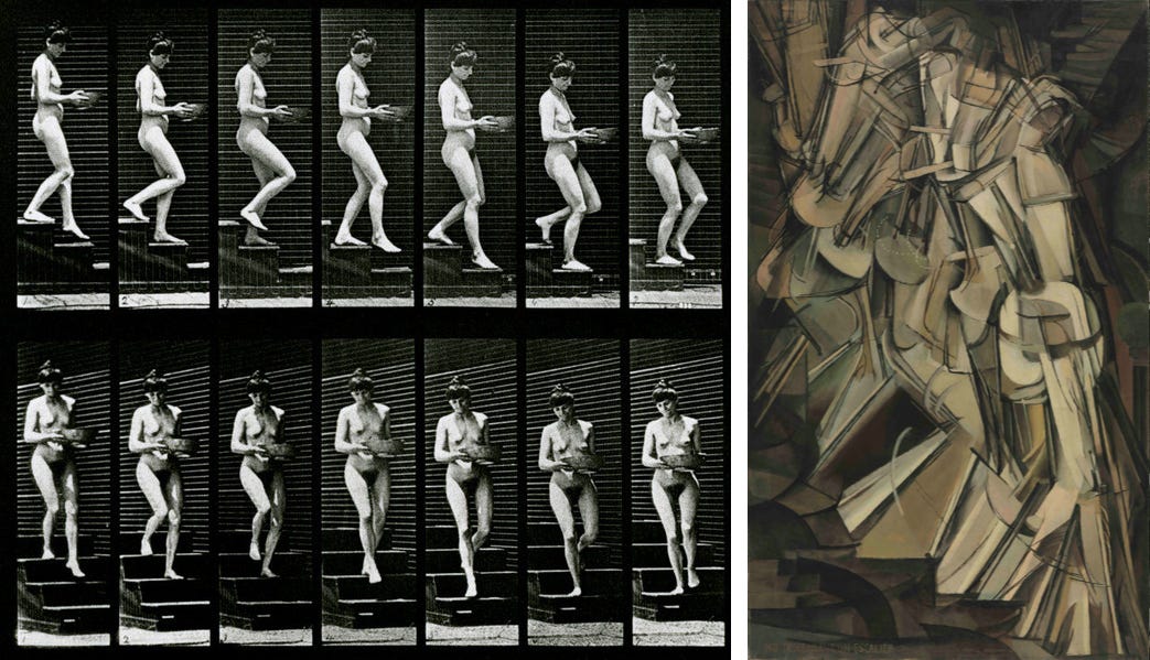 But this is not, historically, the kind of process that leads to great art. Great artists question the standard tools, materials, and styles. When the Industrial Age introduced manufactured paint, pre-stretched canvases, and other conveniences, for example, many artists adopted the new, factory-made materials and continued working in their old style. But the artists we remember didn’t. They took the commoditization of art as their subject. Thus we have Duchamp’s readymades (the urinal and the bicycle wheel, among others) and his Nude Descending a Staircase, which depicted the nude as recorded by rapid camera exposures, a technique that captured people and animals in motion, as well as much public attention. In both painting and sculpture, Duchamp showed how mass production was changing the way we perceived and thought about the world.